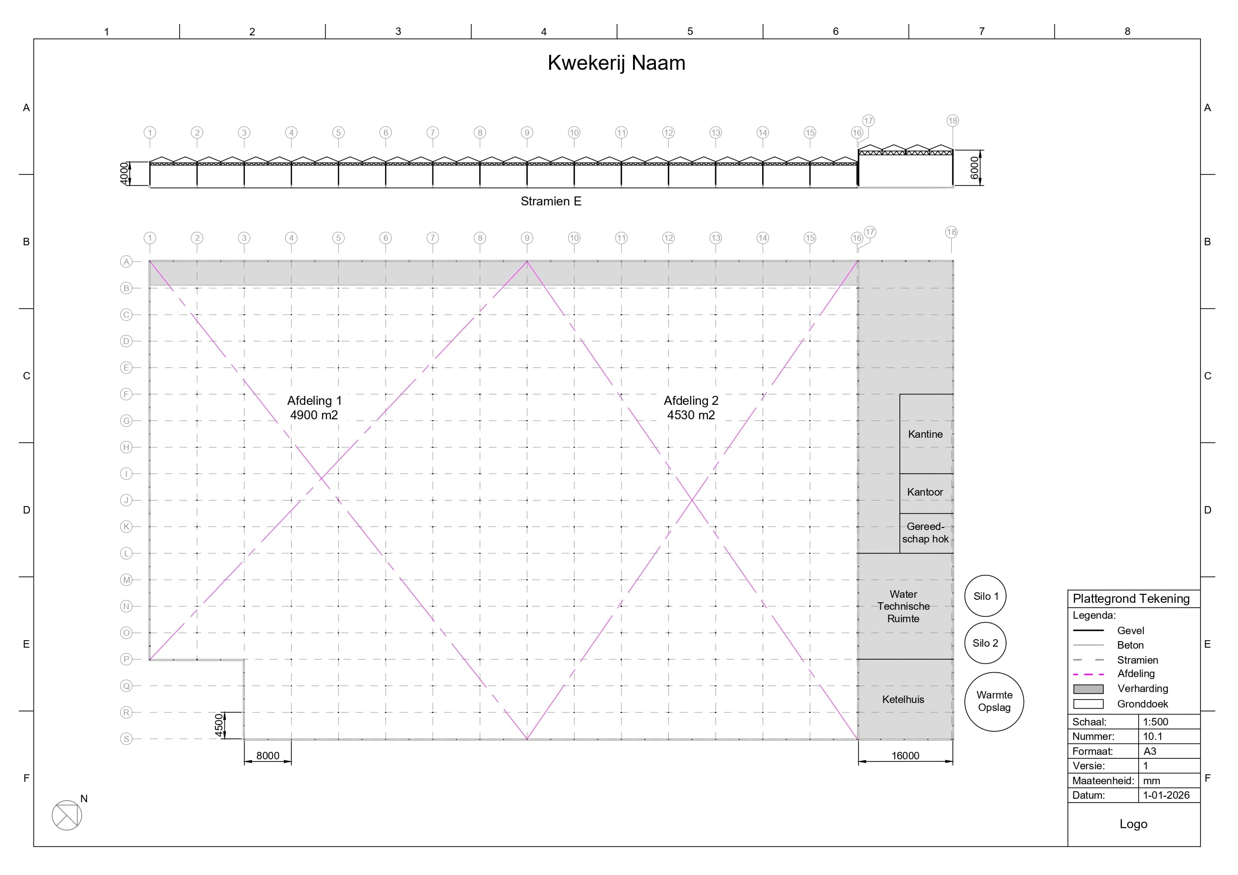 Een handige basistekening van de kas. Paden, afdelingen, kolommen, stramien lijnen en afmetingen op schaal.